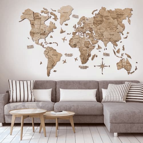 • Detailed map art (ocean names, wooden planes, ships, and compasses) is included in the 3D Wooden World Map for Wall kit.